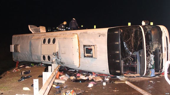A bus traveling from Moscow to Yerevan overturned on November 3, 2015 after the driver rep