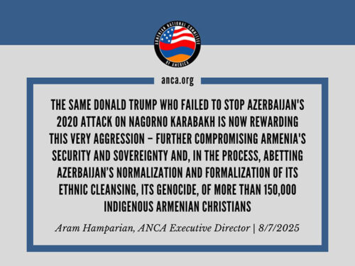 “The same Donald Trump who failed to stop Azerbaijan’s 2020 attack on Nagorno Karabakh is now rewarding this very aggression – further compromising Armenia’s security and sovereignty and, in the process, abetting Azerbaijan’s normalization and formalization of its ethnic cleansing, its genocide, of more than 150,000 indigenous Armenian Christians,” said ANCA Executive Director Aram Hamparian
